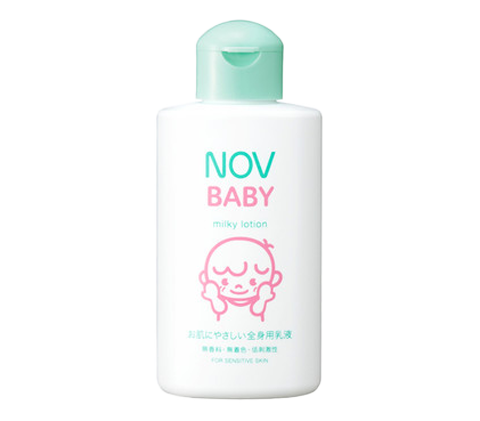 敏感肌の赤ちゃんにも使えるシンプルな成分の低刺激処方、片手でも扱いやすく手からこぼれにくい乳液スキンケア